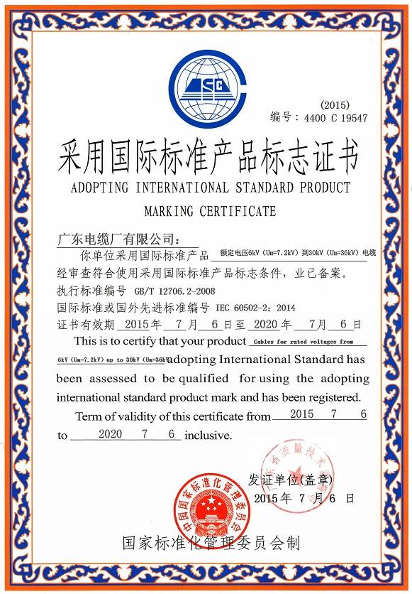 廣東省采用國際標準產(chǎn)品認可證書(6-30kV)